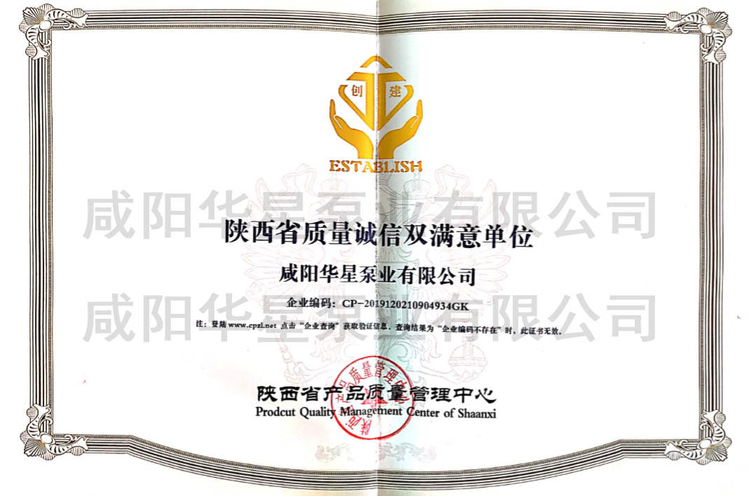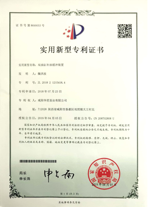 咸陽華星泵業(yè)有限公司專利證書